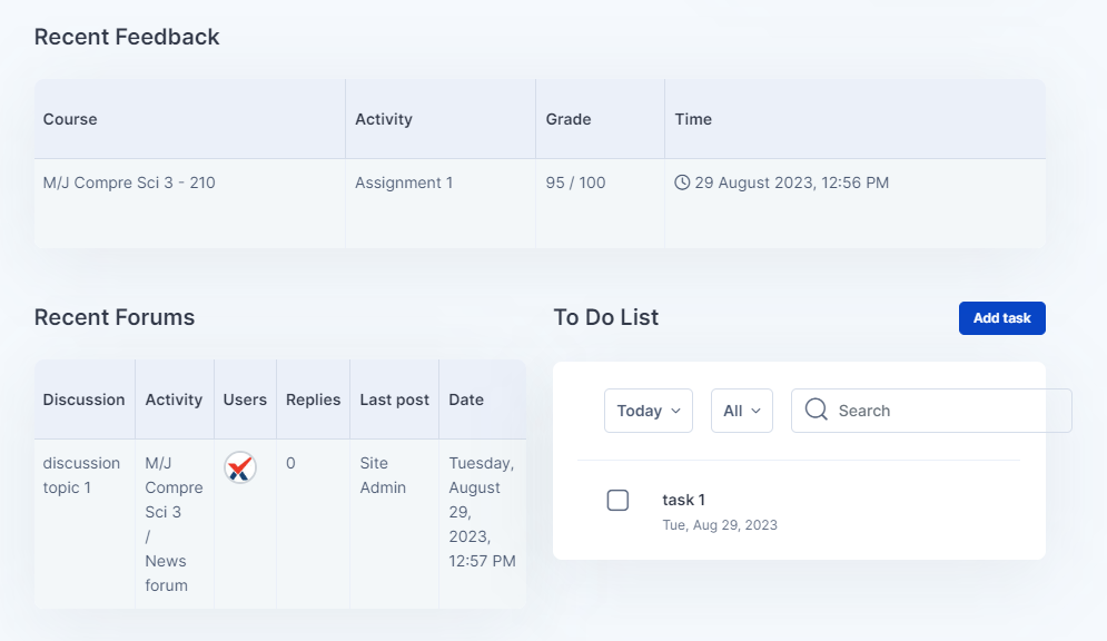 ![]() | The bottom section of the content area on the dashboard has the Recent Feedback, Recent Forums and To Do List blocks. Recent feedback shows the recently graded work Recent forum is for the forum discussions you are active in your courses And the To Do List is the list of tasks created by you or your teachers as a reminder. |