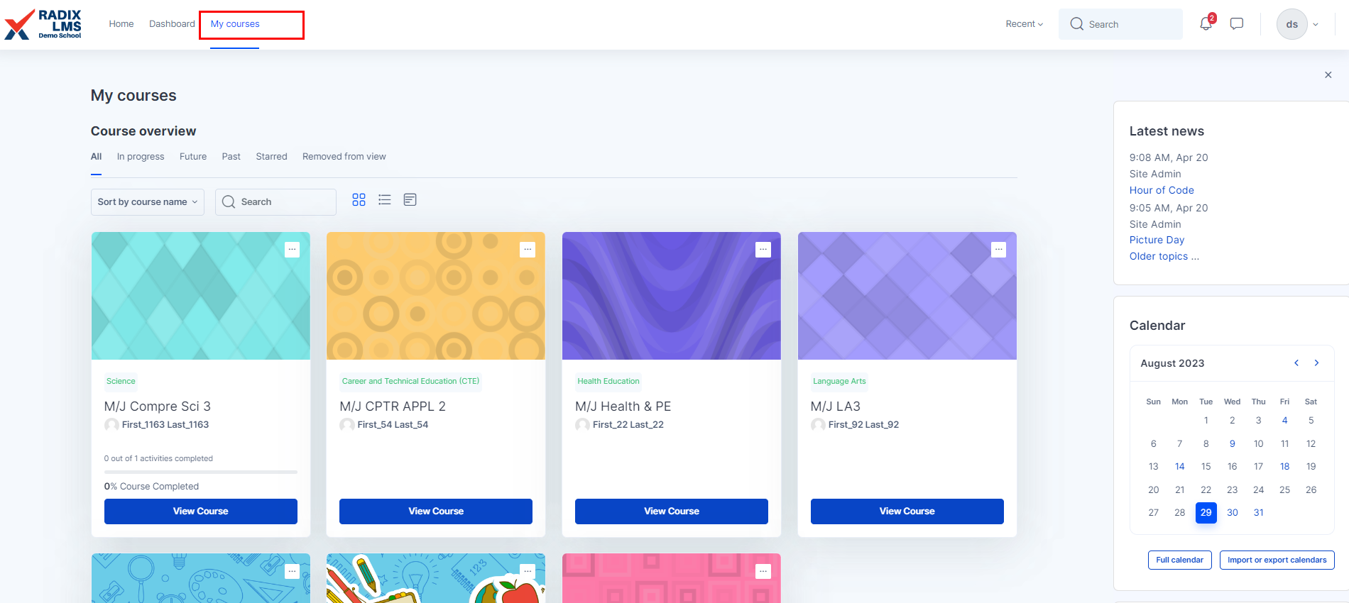 Students will first be directed to their dashboards once they log in. On the dashboard, they will be presented with the following items:
