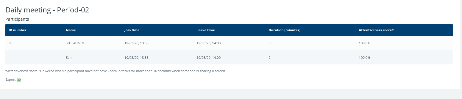 List of participants, duration of their participation, and attentiveness score. This report can also be downloaded to excel spreadsheet.