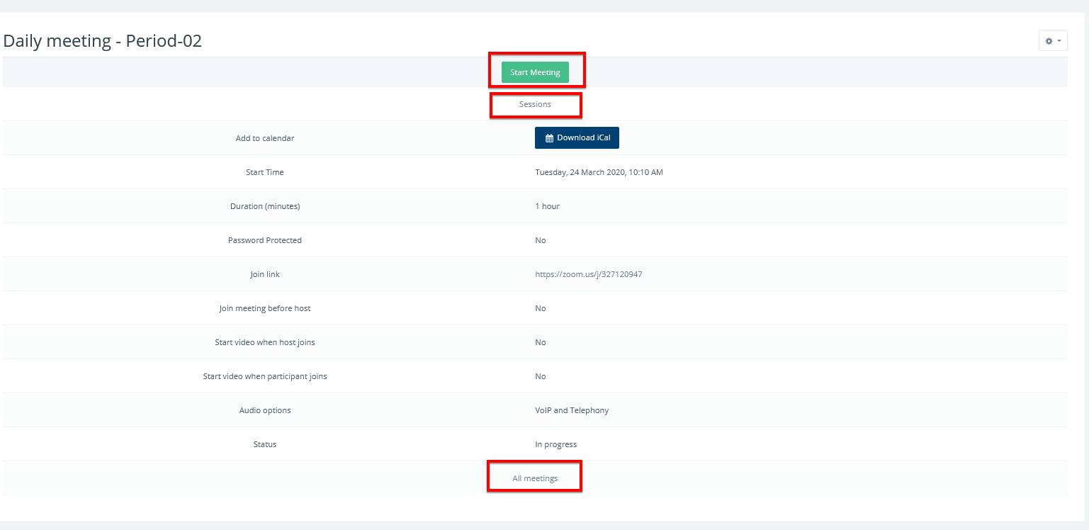 Here you will see the detailed information about your zoom meeting. Start/Join link, ical integration, link to the sessions and all of your meetings.