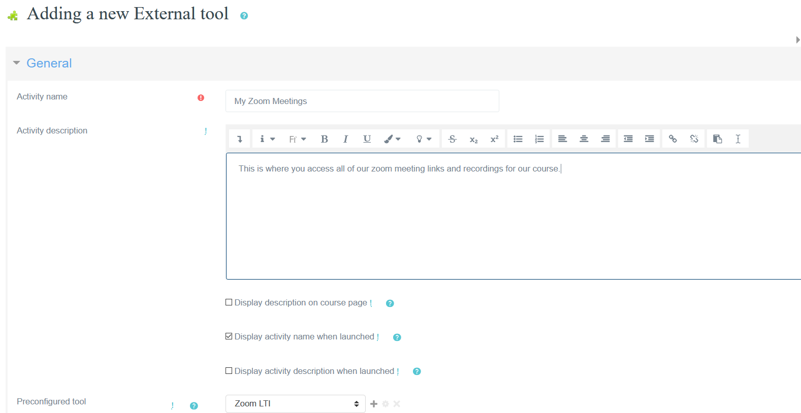 4. On the next window, name your Zoom LTI activity and give a description if you like. Notice that you are not yet creating a session at this step, only embedding your zoom account into your course. So a name like "My Zoom Meetings" or "Algebra 1 Zoom Meetings" would make more sense.